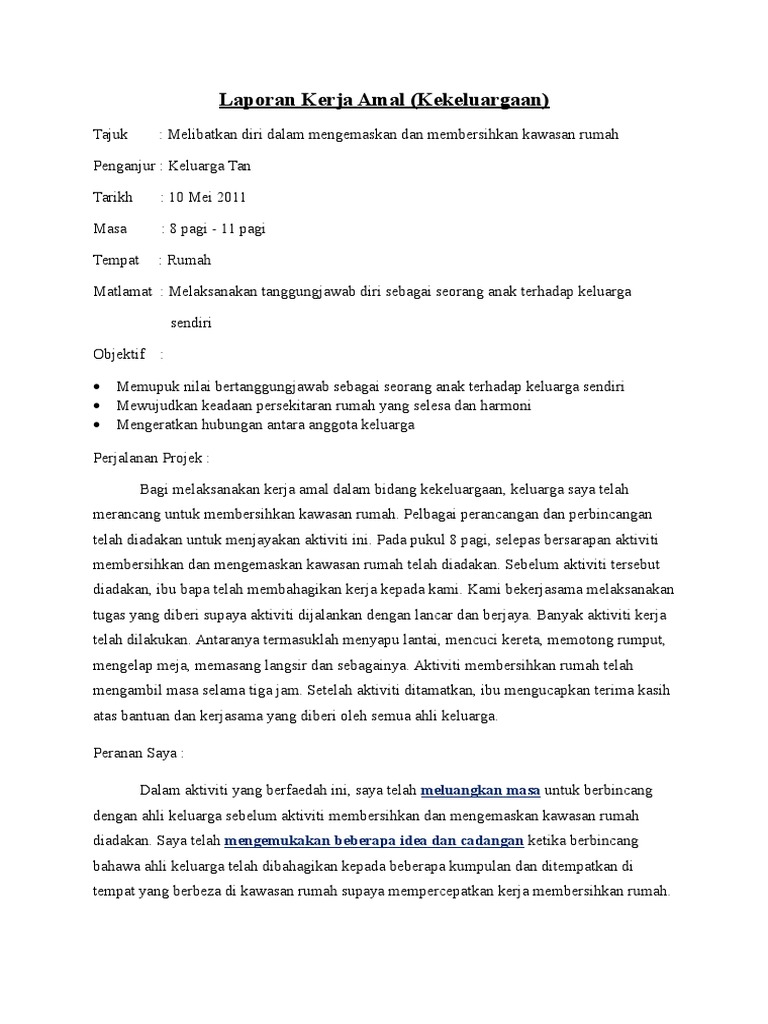 Membantu menjaga anak jiran Penganjur. Contoh Laporan Kerja Amal Kekeluargaan KERJA AMAL 2 Contoh Laporan kerja Amal Bidang 2. Pertimbangan yang perlu diambil kira a Guru hendaklah merancangkan 8 10 tugasan yang berkaitan dengan pembelajaran pendidikan moral.